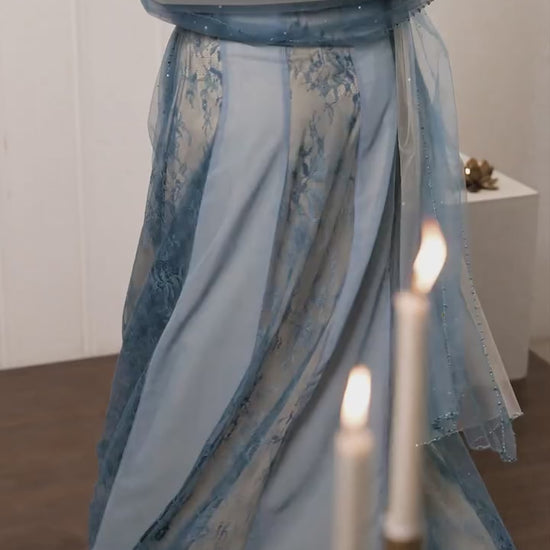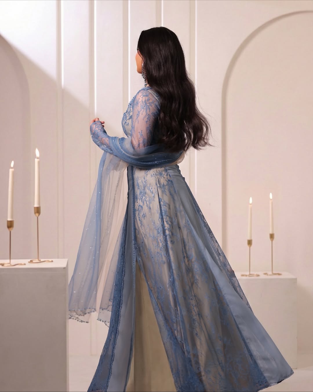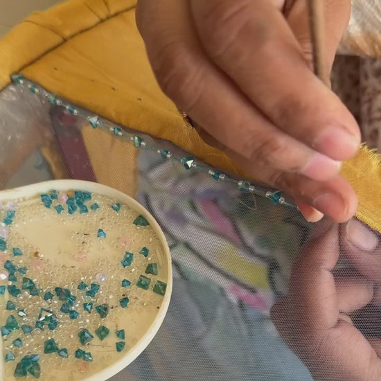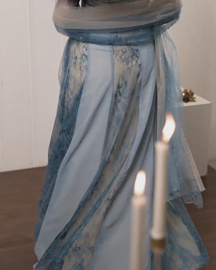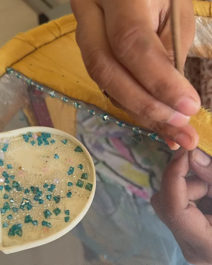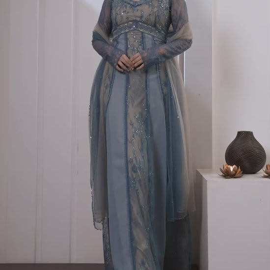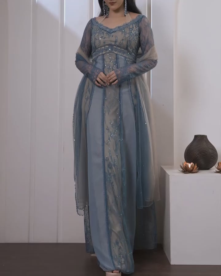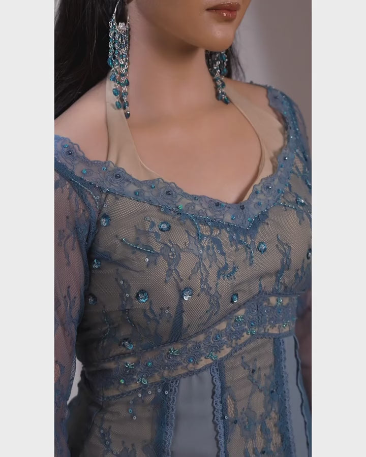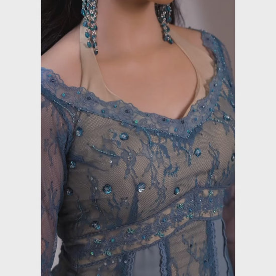 The outfit with peak feminine silhouette is here to embrace you at right places. The colours, crystals, sequins perfectly synchronising to give off the midnight twinkling sky wrapping you!🦋