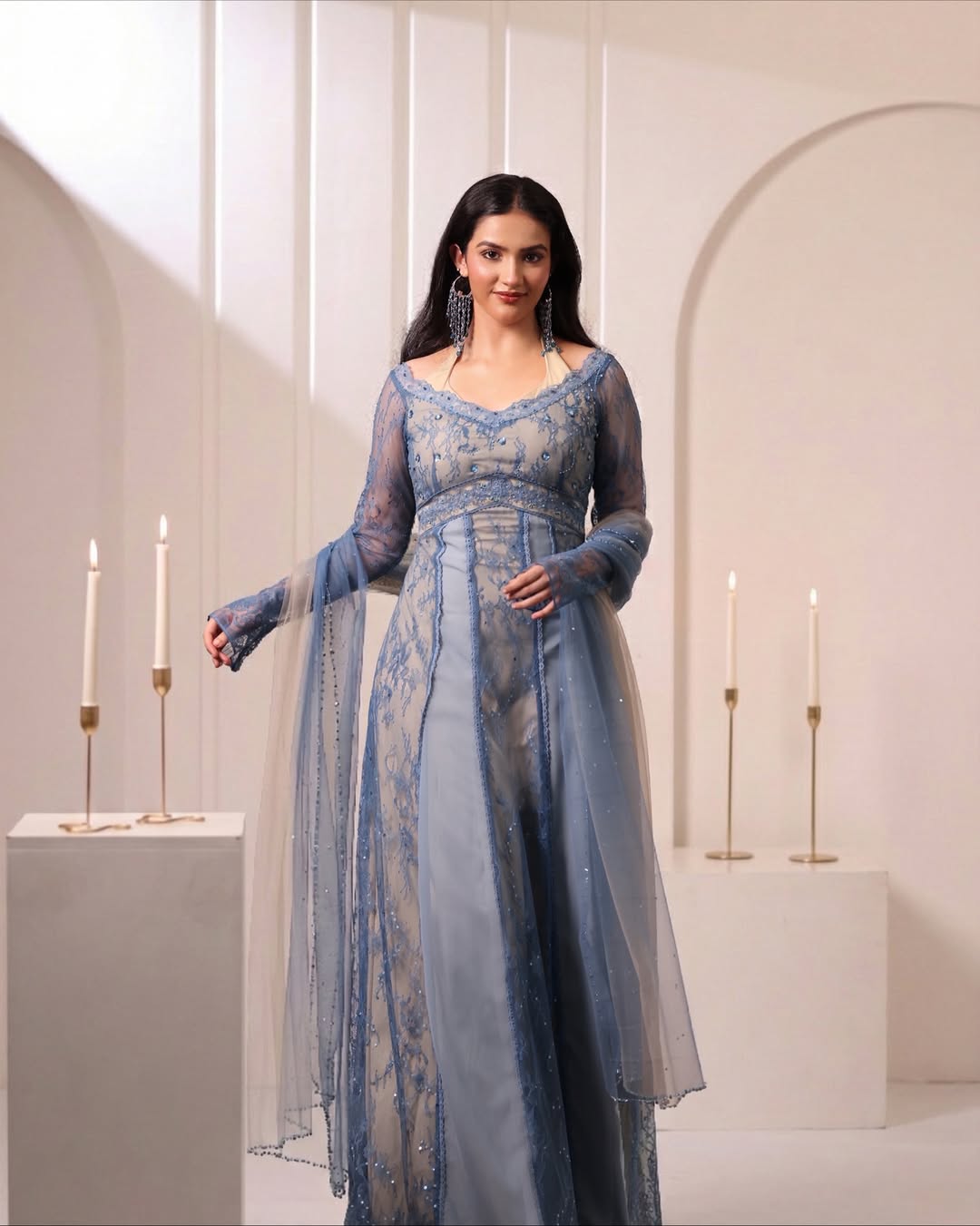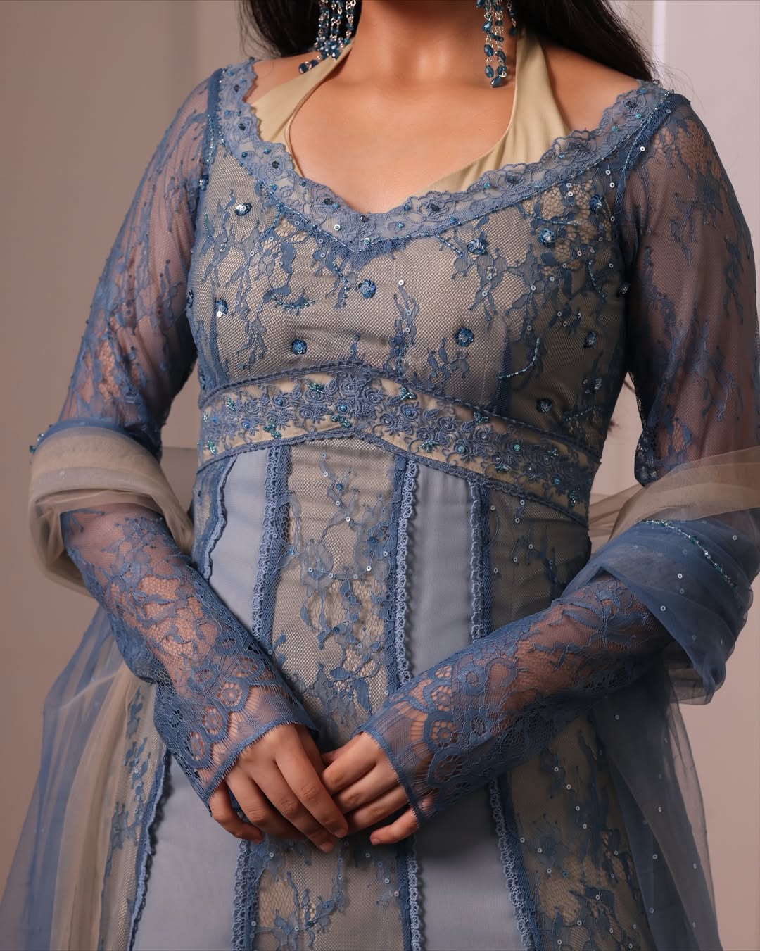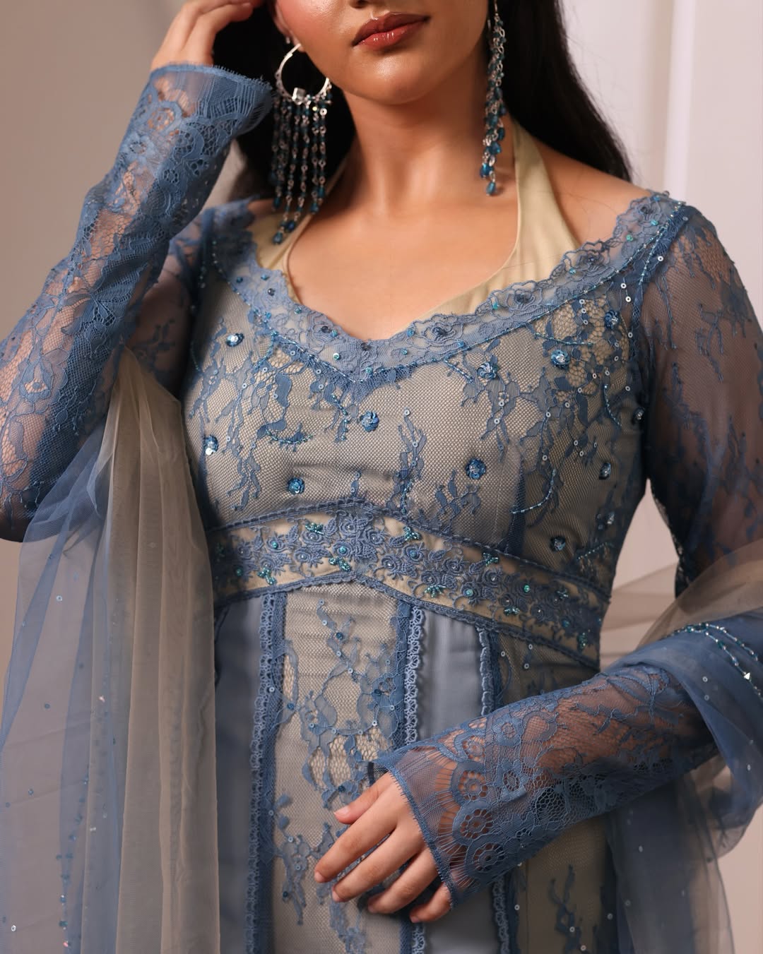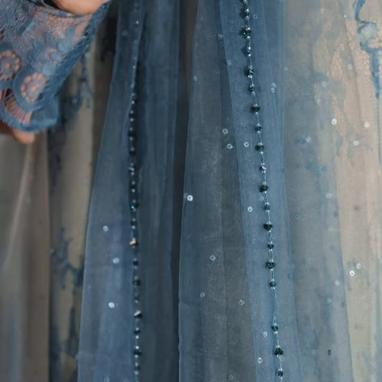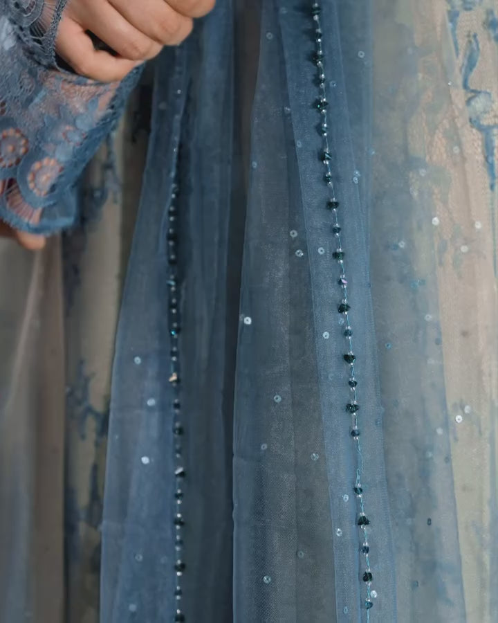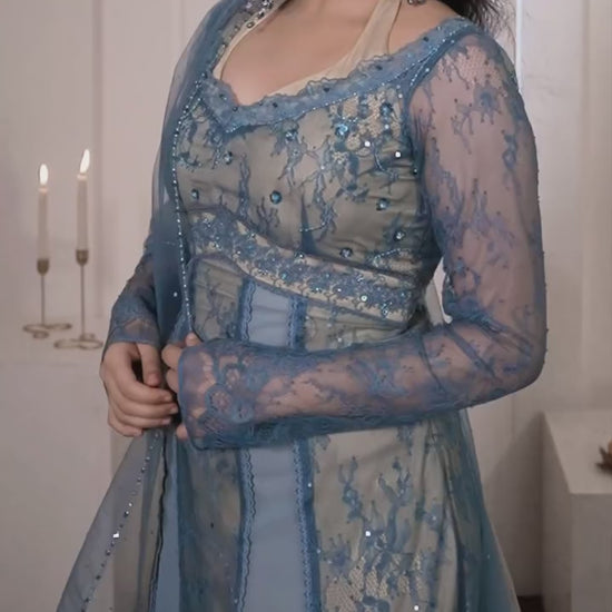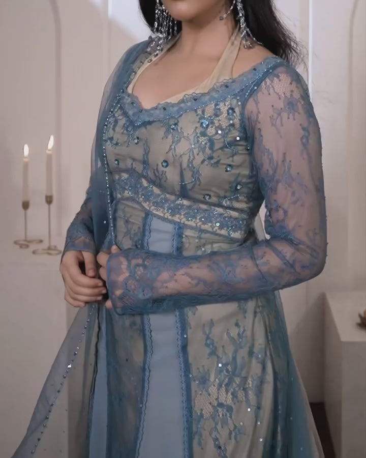 DESCRIPTION : 💫Halter double neckline 💫Rose lace details with hand embroided crystal, sequin and beads work 💫Paired with chic sparkling dreamy dupatta dyed in ombre colours and swoon worthy crystal edging all four sides.